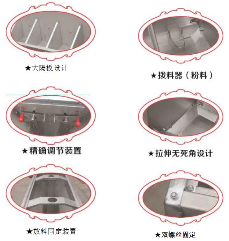 2、安装简单、易操作、出料均匀,料槽里面表面光滑,不易存料,清洁方便。